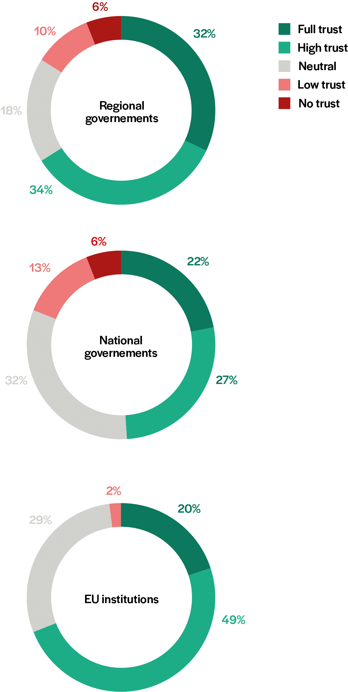 Trust in the EU institutions is relatively strong but varies depending on the extent of city engagement in European programmes. Many cities value EU funding and policy alignment, seeing the EU as an important partner in areas such as climate action, mobility, and urban development. Cities that have better access to EU funds report higher trust. The ones that have more neutral or lower trust are the ones noting challenges of administrative complexity or low reactivity of EU decision-making. However, no city reports a complete lack of trust in the EU, suggesting that while frustrations exist, the EU is still viewed as a credible and necessary actor in urban governance, and an actor that cities expect to have more direct relations with that are not mediated by national governments.