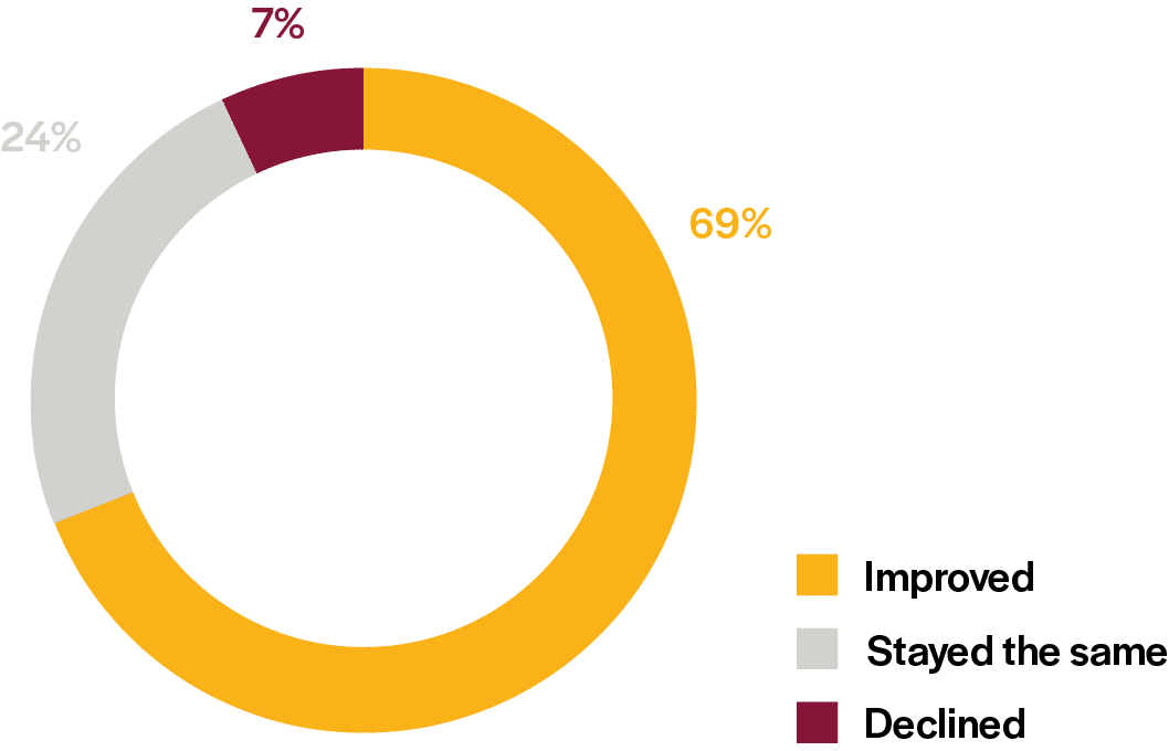 When asked about the cooperation with other levels of government over the past 10 years, nearly seven in ten mayors (69%) across Europe report an improvement in multi-level cooperation, reflecting a growing recognition of the importance of collaborative governance to address urban challenges. At the EU level, progress is evident through initiatives like the Urban Agenda for the EU and the enhanced urban dimension of Cohesion Policy. Nationally, as the OECD reported, governments are aligning urban actions through national urban policies, helping to create a more coordinated approach to urban development. Generally, there has been a broader acknowledgement of the crucial role cities play in tackling major challenges such as climate change, migration, and sustainable urban development.