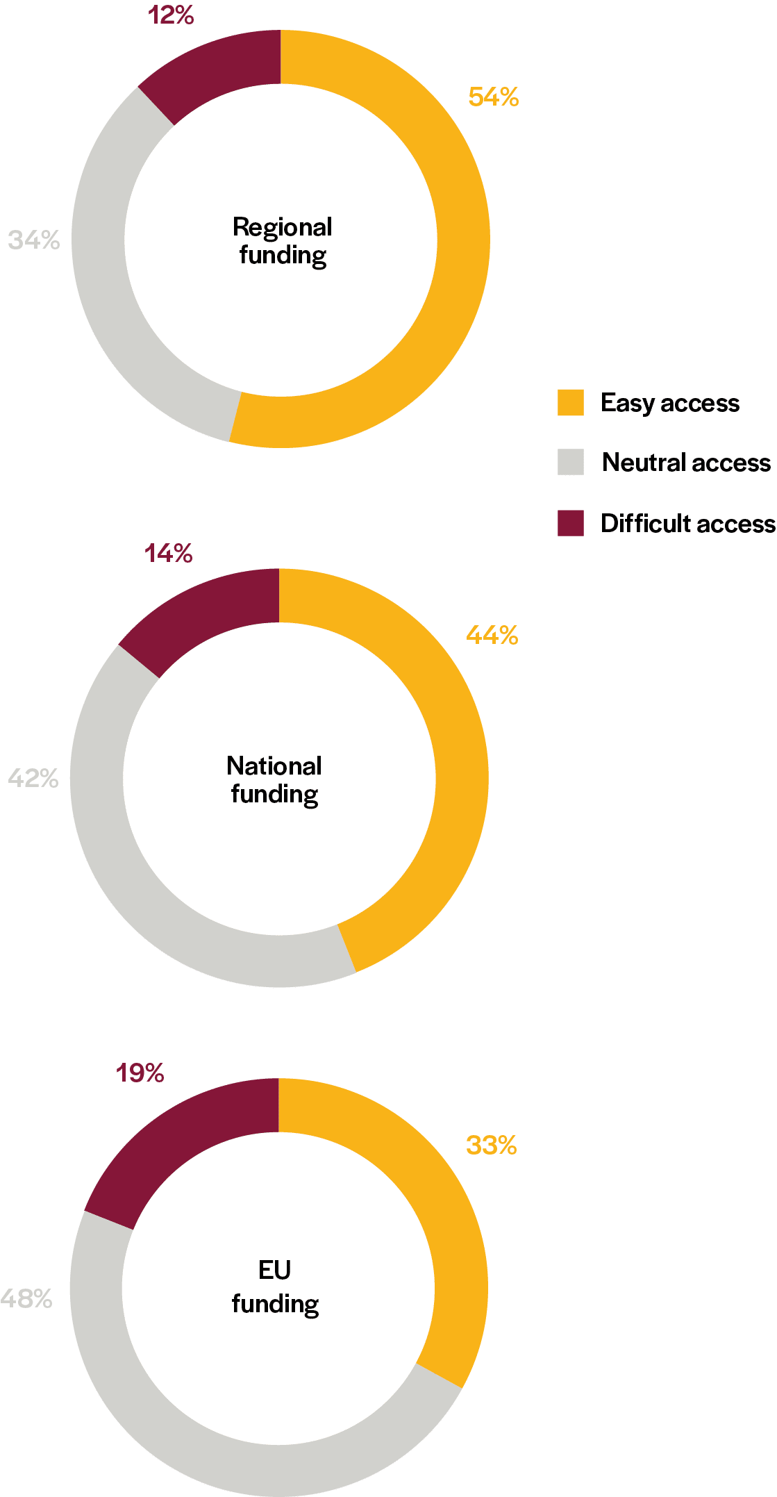 EU funding appears to be the most challenging financial source for cities to access. Only 33% of cities report ease in securing direct EU funding, with many citing complex application processes, slow approval mechanisms, and dependence on national intermediaries. Cities that have benefitted from direct forms of EU funding – either those who perceived easier access to Cohesion Policy and have higher envelopes or those who manage to secure direct funds through Horizon Europe or the European Urban Initiative – tend to have more positive experiences.