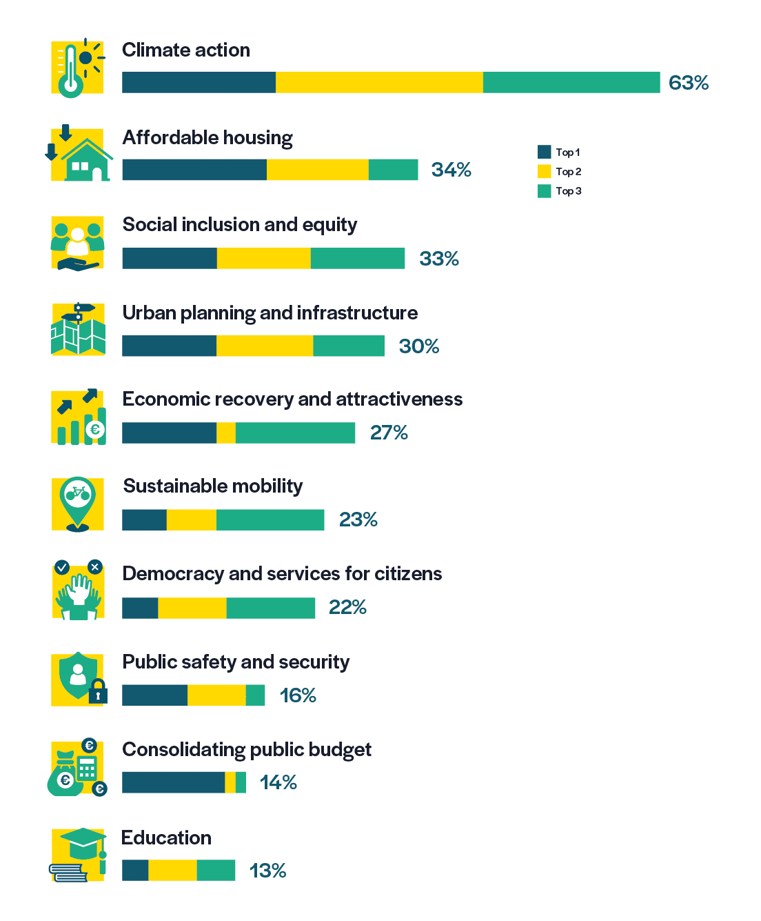 Jumping up into second place, from third last year, is affordable housing, with more than one in three mayors selecting it as a top priority. Interestingly, this year affordable housing is the number one priority for one in six mayors, twice as many as last year. While housing is not an EU competence, the immediacy of the housing crisis makes it clear that EU action to support cities is a priority.