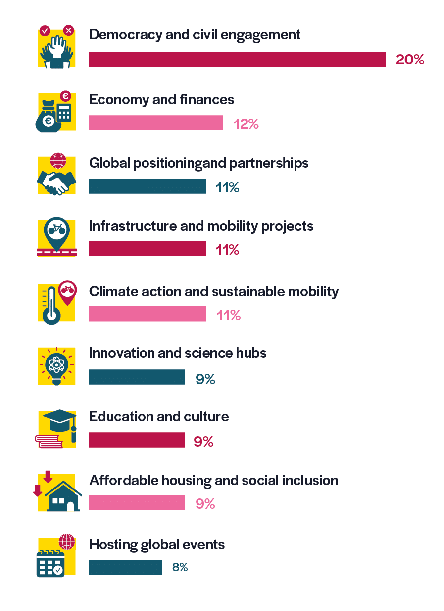 Democracy and services for citizens is also on the rise this year, rising into seventh position (up from ninth place in 2024), significantly higher than the previous year. In the current geopolitical context that throws a shadow over our democracies, mayors are keen to strengthen citizen participation, local governance, digitalisation of public services, and transparent decision-making as a means to increase citizen trust in public institutions.